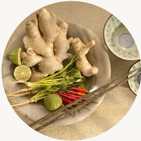 生姜甘辛而温,具有散寒发汗、温胃止吐、杀菌镇痛、抗炎之功效,还能舒张毛细血管,增强血液循环,兴奋肠胃,帮助消化。鲜姜可用于“风寒邪热、伤寒头痛、鼻塞、咳逆止气、止呕、祛痰下气”。