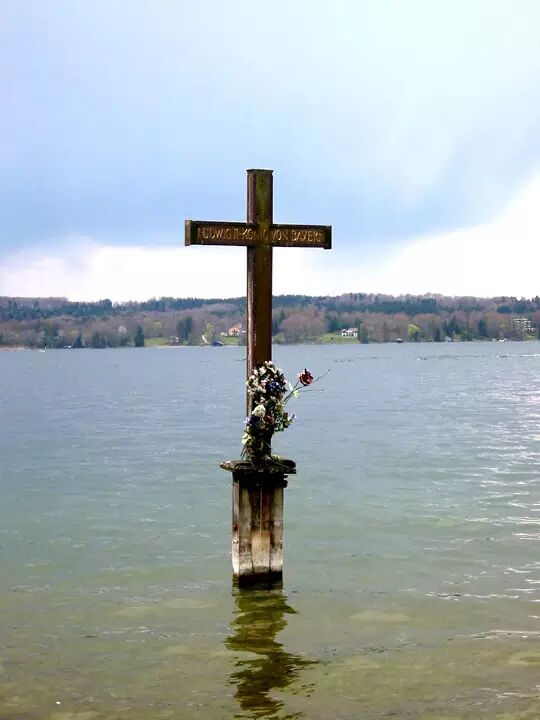 民众纪念路德维希二世在施塔恩贝格湖他去世处竖的十字架
