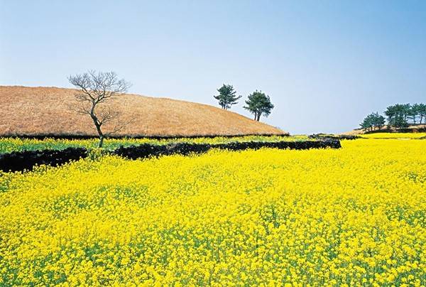 济州岛是韩国春天最先到来的地方,每到初春,这里最美丽壮观的油菜花率先开放。看油菜花的最好去处要属东边的城山浦一带。红色的火山地貌、悠然吃草的马群、古老的灯塔及大海,还可骑着济州矮马,穿越油菜花海,各种摆拍,真是令人陶醉。
