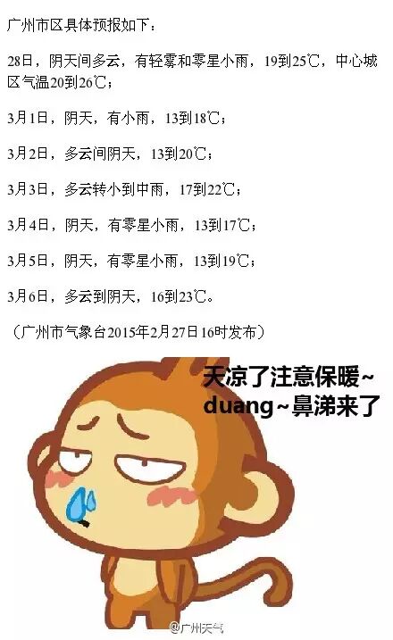 Duang~这两天市区的最高气温都已经冲破28℃,有些人已经短袖加身,小伙伴们是不是有一种被“热坏了”的感觉?但气温过山车很快就要来啦。羊年的第一场冷空气将在今日傍晚携雨光临羊城,届时气温相对今日会有较明显下降,终于可以体验回凉凉春天的感觉啦!