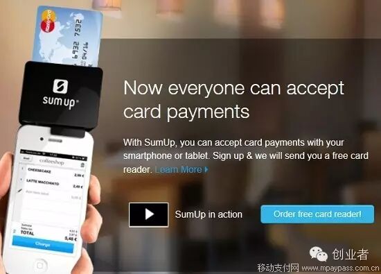 作为MPos(基于移动终端的)服务提供商,SumUp在英国和德国都设有分部,2012年在欧洲的业务拓展到了11个国家,现在在向全球拓展。它的出现是对全球支付市场的一次革新。通过SumUp,商人可以用他们的手机和平板电脑接受借记卡和贷记卡的支付,且更安全、快捷和成本有效,SumUp对每笔交易收取1.95%的交易费用。公司获得了American Express, BBVA Ventures, and Groupon.的风投。