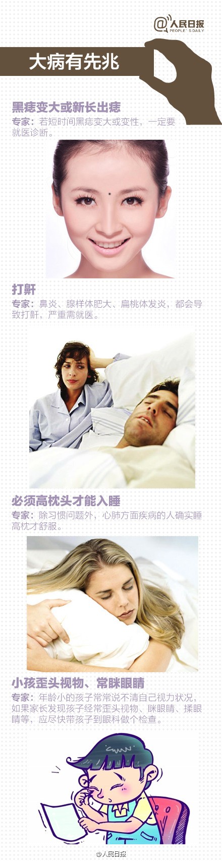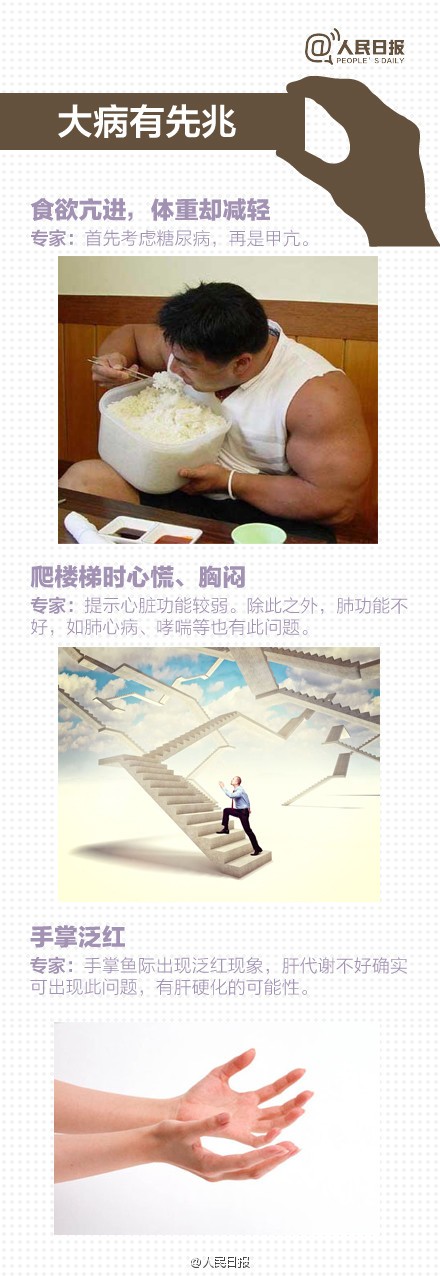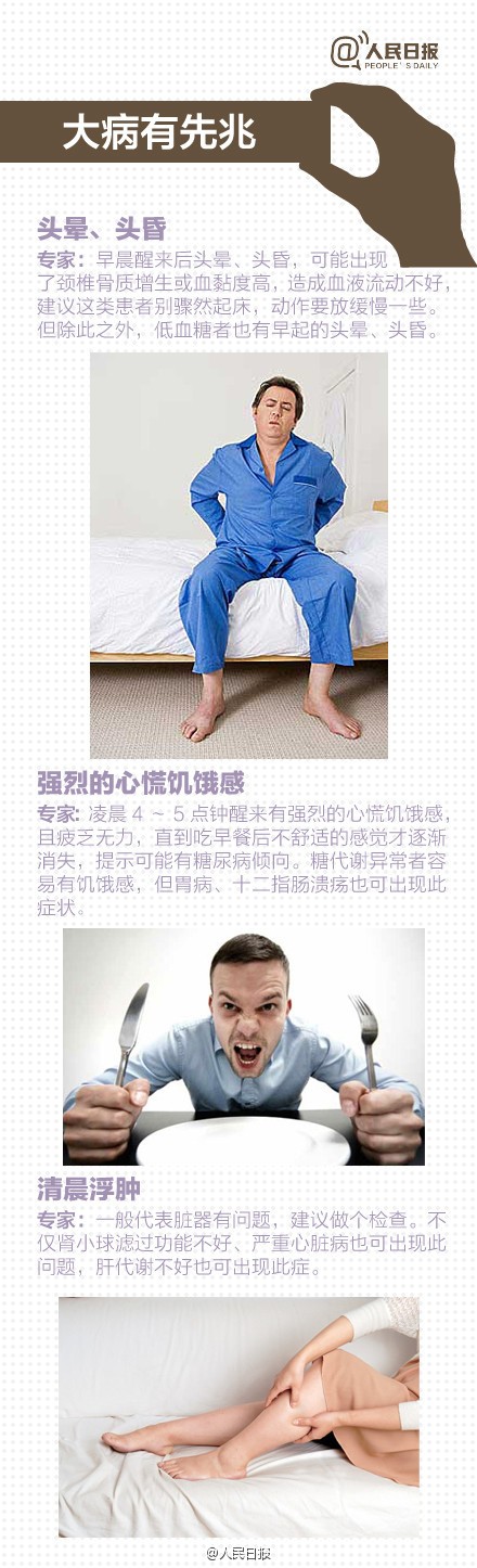 你了解自己健康状况吗?你注意过身体的健康提醒吗?早晨醒来突然头昏,可能是颈椎骨质增生;凌晨醒来心慌饥饿,疲乏无力,有糖尿病倾向;清晨浮肿,脏器可能有问题......别忽视那些身体给你的警告!疾病先兆自查表,供你参考↓↓戳图,对照!