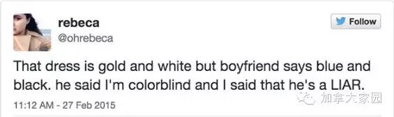 那件衣服是白色和金色的,但是我男朋友却说是蓝色和黑色的。他说我是色盲,我说他是个骗子。