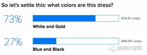BuzzFeed专门做了一个投票,目前来看白金党占了上风,共有97.4万人,占73%;蓝黑党则只有36.8万人,占27%。