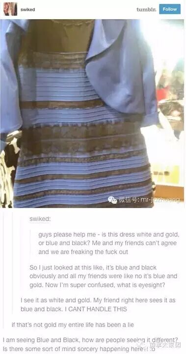 没想到,Tumblr网友的意见同样分裂成两派,一部分人看到的是蓝色和黑色,另一部分人看到的是白色和金色。