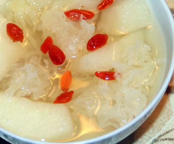 银耳用清水泡开,莲子需要中间无芯的,将银耳、冰糖(三两左右)、枣子、莲子、枸杞放入冷水中,开火,加热,煮沸,不断搅锅,直到银耳胶化,汤粘稠即可。