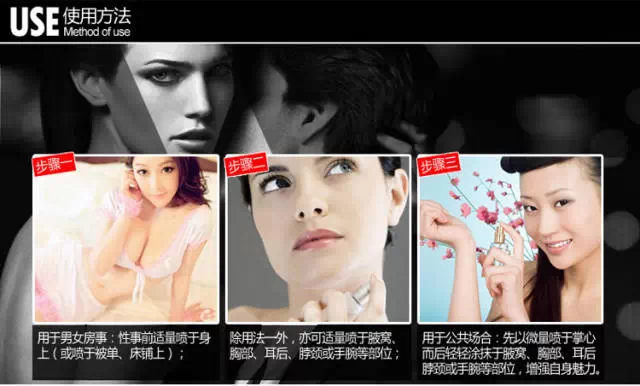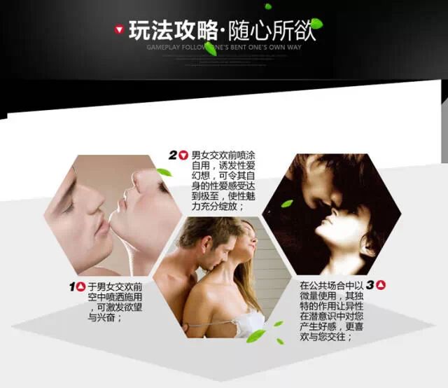 1、于男女交欢前空中喷洒施用,可强力激发女性的性欲望与性兴奋;