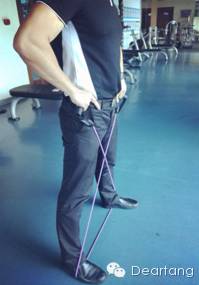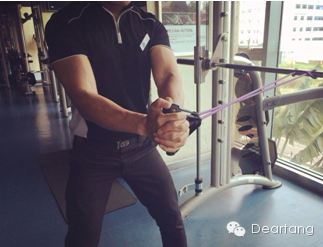 每侧拉到胸前停住30秒后,做十个快速向扣绳子的反方向拉。