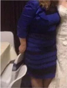 认为是蓝黑色的人,注意到了照片右侧的强烈的橱窗暖黄色光线直射和漫射,暖黄色灯光和阴影的高色温(偏蓝)对成像的影响差不多抵消,而逆光拍摄强行调高了明度让它看起来有点泛白。然后蓝黑党的大脑把图片降低了明度,提升对比度,看到的就是蓝黑的衣服,所有有人说,蓝黑党对色温环境的判断经验更准确一些。
