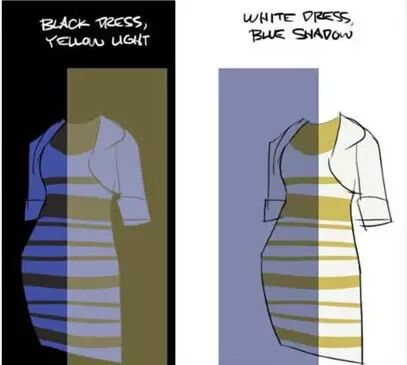 威尔斯利学院研究颜色与视觉的神经科学家康威表示:“当你看见这张照片时,你的大脑正在根据日光矫正这种色差。所以如果人们忽视环境光源中蓝色的部分,则他们看到白色和金色;而如果他们忽视金色的部分,则他们看到蓝色和黑色。”