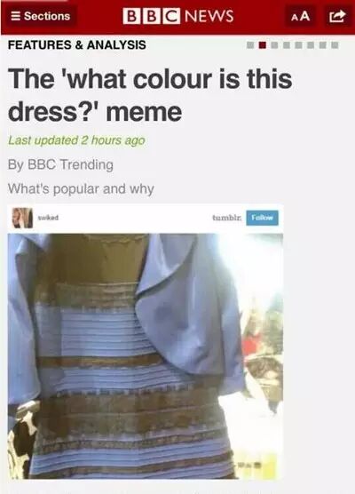 觉得是白金色的人,认为这张图处于逆光,大脑的经验认为受到了阴影的高色温(偏蓝)影响,大脑直觉处理要调高亮度、提升明度、改变白平衡色系向暖“去除蓝光阴影影响”,最终把棕黄和淡蓝色处理成了“金色和白色”