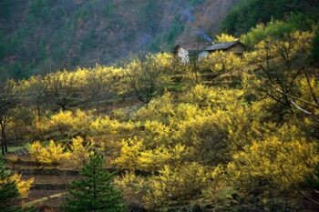 山茱萸是我国传统中药材,又称枣皮、萸肉、药枣;蜀枣、山萸、山萸肉、实枣子、红皮树等。人们种植山茱萸更多的是为了它的果,又有几人见识过它的花呢?当迎春蓓蕾初绽的时候,山茱萸已悄然开花,在仍显苍茫寂寥的山野,金黄的伞状小花,像孔雀冠上的金翎,又似如云秀发上的步摇。像第一缕春光突然灿烂在乍开的眼前,却比春光更浓烈,恣意的开在田间地头。金灿灿的花,红亮亮的果,装点着田野山涧,绚烂了春的画卷。