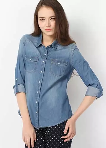 08 衬衫与牛仔裤是常见的搭配,不过牛仔衬衫与连衣裙相搭,你有尝试过吗?中长款的牛仔衬衫刚好及臀,条纹连衣裙却包住了臀部,在衣摆下露出小翘臀,很个性的搭配,却又足够性感,是的,性感。