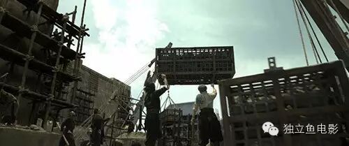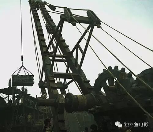 (巨大的吊机需要数十名壮汉才能运转。成龙大哥也搬砖啊!)