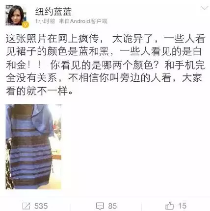 有网友将一条裙子图片贴上网,让大家说说是什么颜色。结果没想到,这个话题一下就在网上炸开了。有人说是黑+蓝,也有人说是白+金,为什么会有不同的色呢?你看到的是什么色?