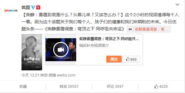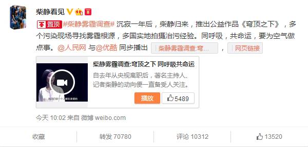 通过@柴静看见V (微博)首发的置顶微博已经得到了70780次转发、10312次评论和13520次点赞,优酷官方微博发布的相关微博也得到了26567次转发、3097此评论以及4220次点赞。