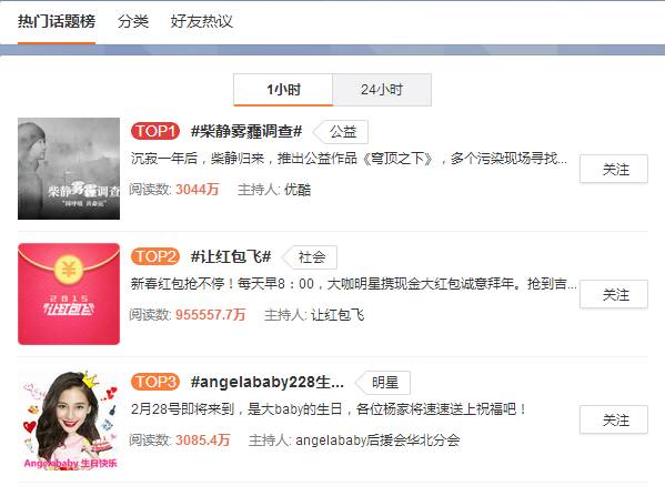 截止到今天(2月28日)下午17点45分,由优酷官方微博主持的、名为#柴静雾霾调查#的微博话题以3044万阅读数成为当前热门话题Top1。