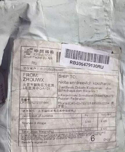 据曝光的图片显示,有从北京发往俄罗斯、乌克兰等地的包裹。其中一份寄往俄罗斯的快件显示,寄件人“ZHOUWX”,从北京市朝阳区某地万红路寄出,一旁的条形码编号为“RB206479130RU”,覆盖了单子上的原始条形码。根据包裹上的邮递单号可查询到,该包裹系退回包裹,于2014年12月9日到达俄罗斯,经收件派件,追踪信息定格在12月26日,地点为莫斯科国际邮件办公室。而寄件方的地址是一家物流公司,客服人员查询单号后称没有相应的物流记录。