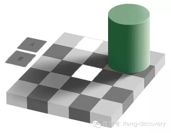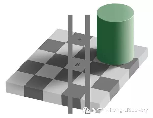 为什么会这样?A、B 方块既然是同样的颜色,那么其反射的光也是一致的,亮度应该是一致的。但我们却明明觉得是两种颜色。这里面究竟出了什么差错?其实这都是大脑造成的,因为根据我们的经验,挡住光源而形成的阴影部位,其反射光总是会比较低,即亮度低。所以为了让我们看清阴影处的物体,脑就对明度作出“补偿”,在处理过程中“人为地”加强阴影部分的明度。