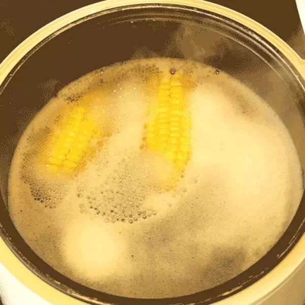 将一根玉米棒掰成两半,一半用清水煮,一半加入洗洁精煮。加了洗洁精的玉米,煮起来就成了下图所示的样子。