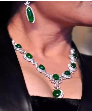 这身翡翠套装价值不菲,戒面尺寸在20*15左右,极品种色。项链大约在16颗,尺寸在15*10.手镯是冰种满绿,稍许有棉。总一套价格在6000万以上。