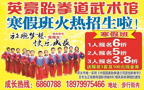 步行街英豪跆拳道武术馆至今成立8年,是市教委、市体育局批准的一所萍乡市最专业、最正规的人才培训基地,现有精英教练十余人。