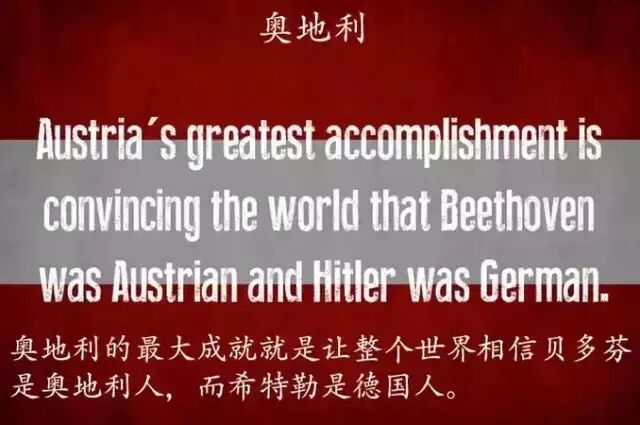 奥地利人的另一个成就是:发动了两次世界大战,但是两次都输了,但他们让很多人以为这两次世界大战都是德国人挑起的。