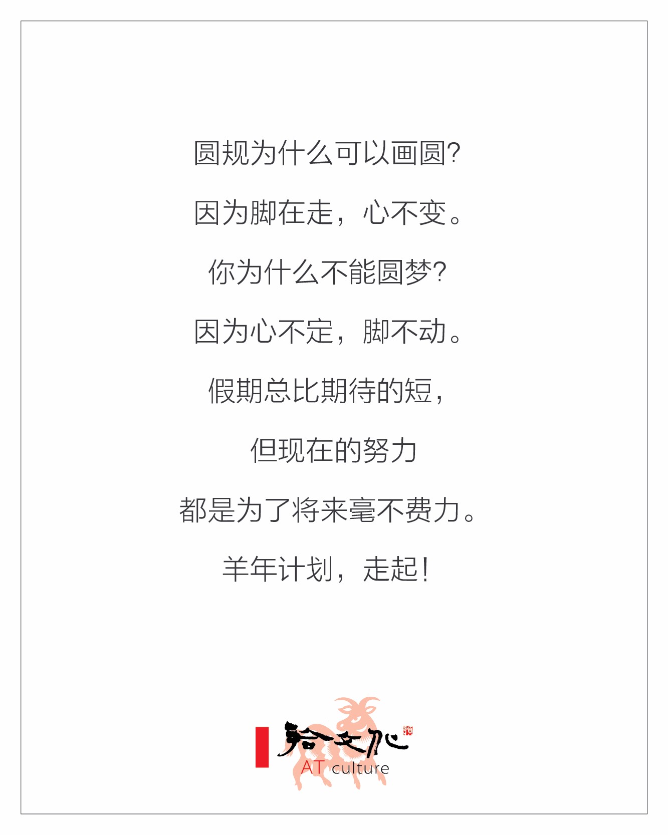 圆规为什么可以画圆?因为脚在走,心不变。你为什么不能圆梦?因为心不定,脚不动。人与人之间的差异,其实很简单:你在赖床,他在锻炼;你在打游戏,他在多读书;你在应付工作,他在用心工作;假期总比期待的短,但现在的努力都是为了将来毫不费力。羊年计划,走起!