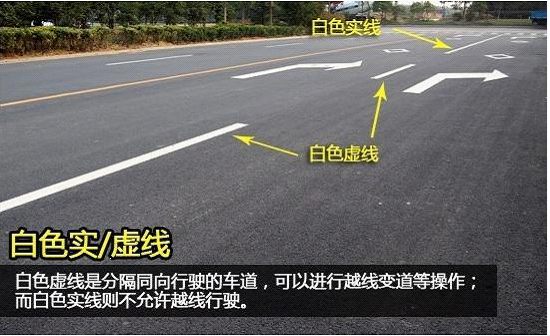 通常道路上的标线都以白色居多,其中白色虚线是分隔同向行驶的车道,可以进行越线变道等操作;白色实线则不允许越线行驶。