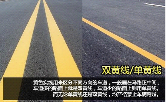 黄色实线用来区分不同方向的车道,一般画在马路正中间,车道多的路面上就是双黄线,车道少的路面上则用单黄线。而无论单黄线还是双黄线,均严格禁止车辆跨越,因此压线行驶、超车或者掉头等都是不允许的。
