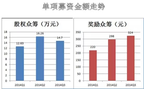 据速途研究院统计,2014年第一季度,国内众筹募资总金额约5245万元,第二季度累计募资13546万元,环比增长了158.3%,第三季度众筹募资总金额达到27586万元,较上一季度增长了103.6%,预计第四季度中国众筹募资总金额将达到4.45亿元,其中包括奖励众筹9998万元,股权众筹34482万元。可见众筹规模在2014年,各个季度都达到了成倍多增长的势头,可见中国的国内众筹行业仍处于飞速发展阶段。