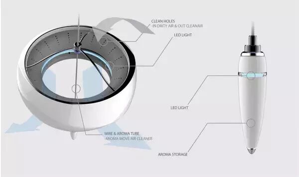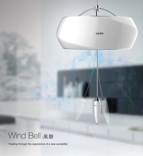 「Wind-bell」是一款空气净化器,设计的灵感来于中国传统特色的风铃,古时候的风铃就是在钟罩下面挂着一块鱼形金属薄片,在风的吹动下,发出动听的声音。