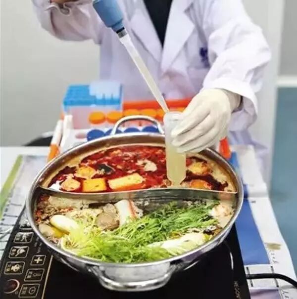实验人员分六个时间段从清汤锅、麻辣锅中分别吸取40ml的火锅汤装入取样瓶待检。