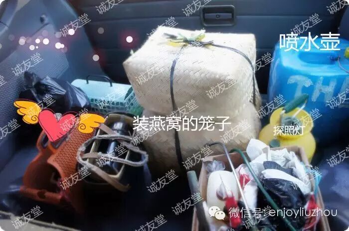 今天是采燕窝的日子,由于燕屋在比较偏远靠海的村庄,我们大家一大早就出发去采燕窝。整装出发,小天使们有没有看到车上装满的是一堆采燕窝用的工具。有探照灯、有喷水壶、还有装燕窝的笼子,还有采燕窝的铲子等。