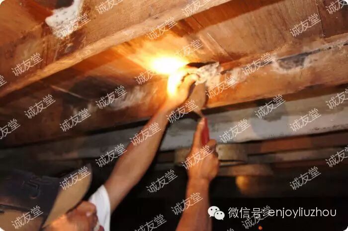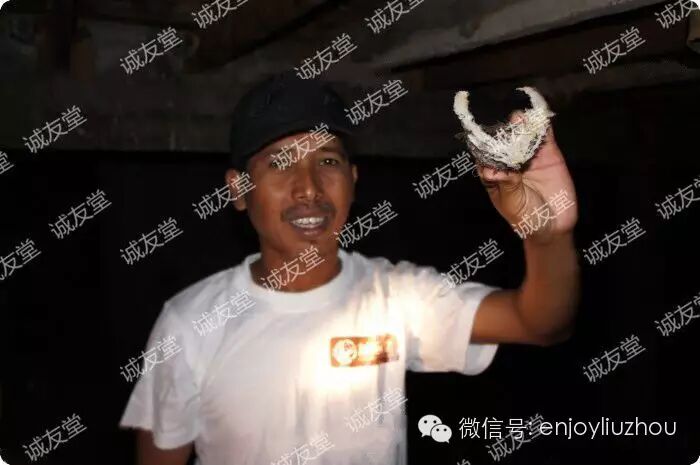 另外负责采燕的工人用铲子小心的把燕窝铲下来。后面的姑姑貌似受不了燕窝屋的腥味,带上了口罩,其实没那么严重啦,这就是大自然的味道嘛,来来来,深呼吸一下~