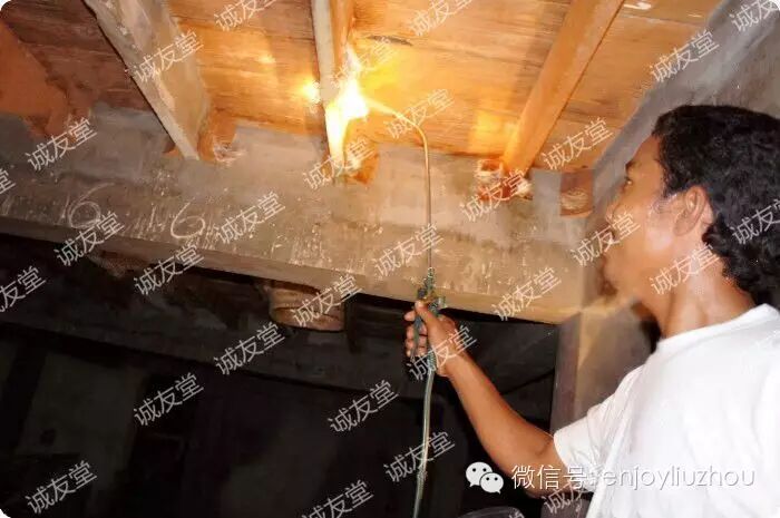 嗯,确定了可以采摘的燕窝,就先由负责喷水的工人在燕窝边角喷一下水,湿润一下避免采摘时会损坏。