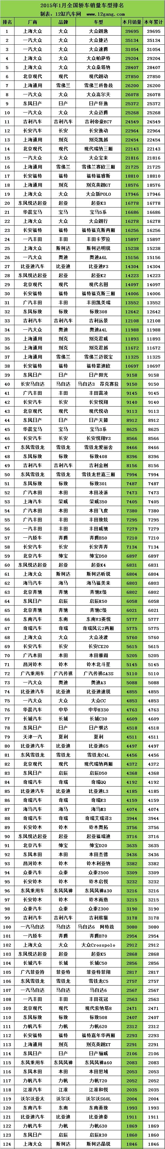 春节假期刚刚结束,很多人错过了2015年第一个月的车市销量数据,茶哥整理了一下上个月(2015年1月)全国乘用车销量排行榜,榜单包括轿车、SUV、MPV,数据里隐藏了大量信息。废话不多说,赶紧来看看榜单吧。