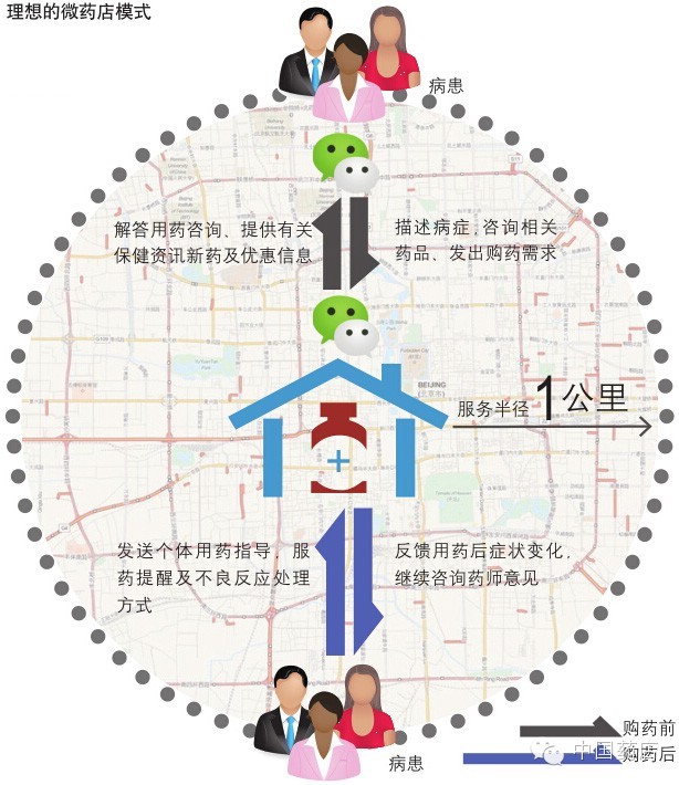 而微药店则是直接在微信上开店,线上交易下单,直接达到交易的目的。同时,还可以实现对病患售前售后的药事服务。据思妙(北京)医药科技有限公司(灵妙微药店的开发公司)产品总监王敏介绍,理想的微药店模式大致如下图。