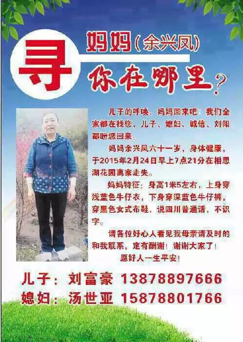 导读 2月24日大年初六,家家户户还沉浸在春节的喜庆氛围中,然而这天对于刘富豪一家人来说,却是非常煎熬的:当天早上,刘富豪和家人突然发现,母亲余兴凤不见了。他们在南宁苦苦寻找了几天,如今,依然没有母亲的音信。