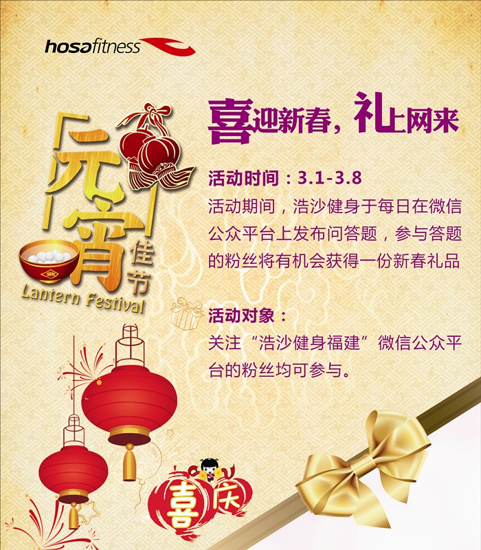 从3月1日到3月8日,在浩沙健身福建的微信公众平台上,每天发布一道抢答题,每日抽取幸运粉丝。答对的朋友,就有机会成为幸运粉丝,获得新春礼物。