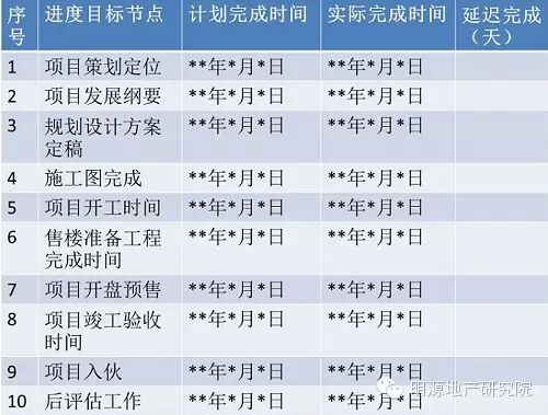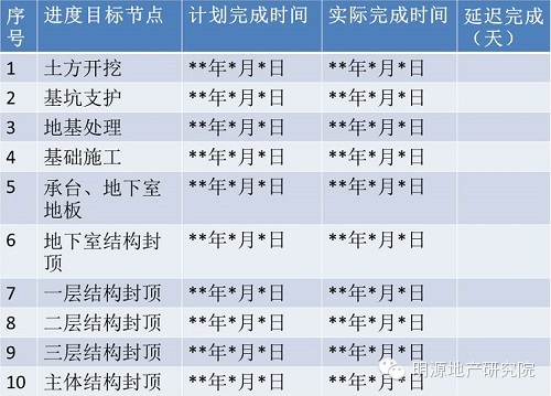 序号 进度目标节点 计划完成时间 实际完成时间 延迟完成(天)
