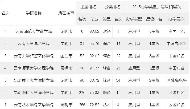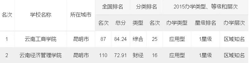 在2015云南省最佳独立学院排行榜中,云南师范大学商学院雄踞榜首,全国排名第6,入选2015中国五星级独立学院,跻身中国一流独立学院,堪称2015云南省最佳独立学院;云南大学滇池学院名列第二,全国排名第31;云南大学旅游文化学院位居第三,全国排名第52。