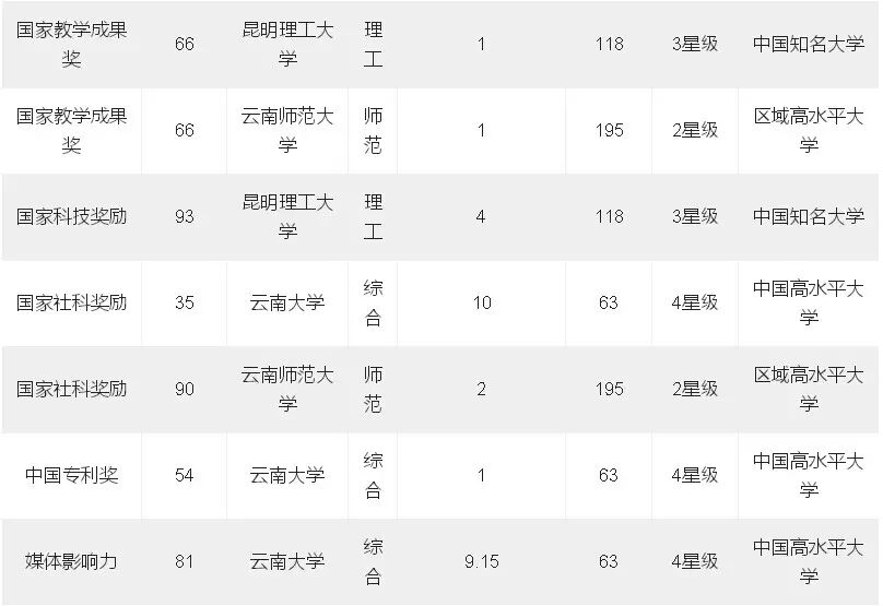 核心指标排名方面,云南高校则是各美其美,仍存在较大进步空间。榜单中,云南大学国家级社科奖励最多,国际化水平和学术影响力最高、媒体影响力最大;昆明理工大学国家级科技奖励最多;云南民族大学最受外国政要青睐。