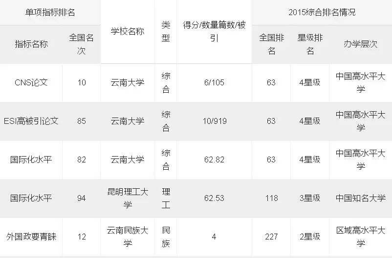 2015云南省高校各核心指标排名跻身全国100强的大学