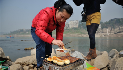 说明:江岸边开阔平坦,鹅卵石多,随手挑几块合适的一搭就是一口好灶,离水源也近,不易起火,是非常好的烧烤地。喜欢自备工具的或是想“偷懒”租借工具的,都能在江边找到适合自己的烧烤地点。