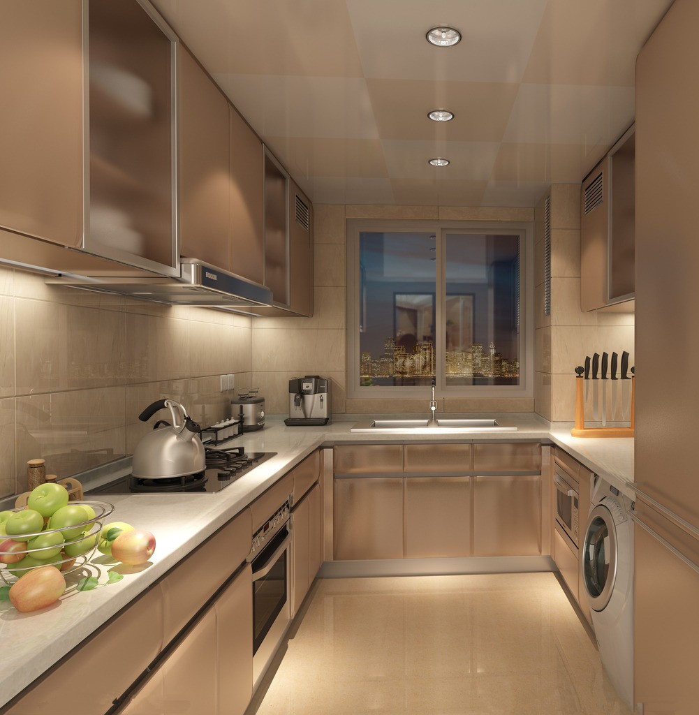 最好吊全顶,以便于擦洗。通常用PVC、铝塑扣板吊顶。注意应选用抗老化的材料,因为厨房整天烟熏火燎的,装修材料老化的快。