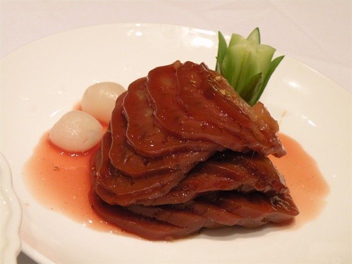 舌缘牛肉薄烧一经推出,更是广受赞誉。武汉著名曲艺家何祚欢在品尝后特别喜欢,觉得是舌尖上的缘分,并为它专门题字“舌缘”。于是菜名就从龟井牛肉改名为舌缘牛肉。这道菜的牛肉,取材牛的腹部。据说牛只能取几块,品质非常高,达到可以生吃的级别。牛肉被切得很薄很薄。在铁板上略微翻烤就出炉,又嫩又香。它有三种口味,原味、红酒味以及酱香味。从香嫩到饱满,到浓郁.富有层次的口感在舌尖释放。