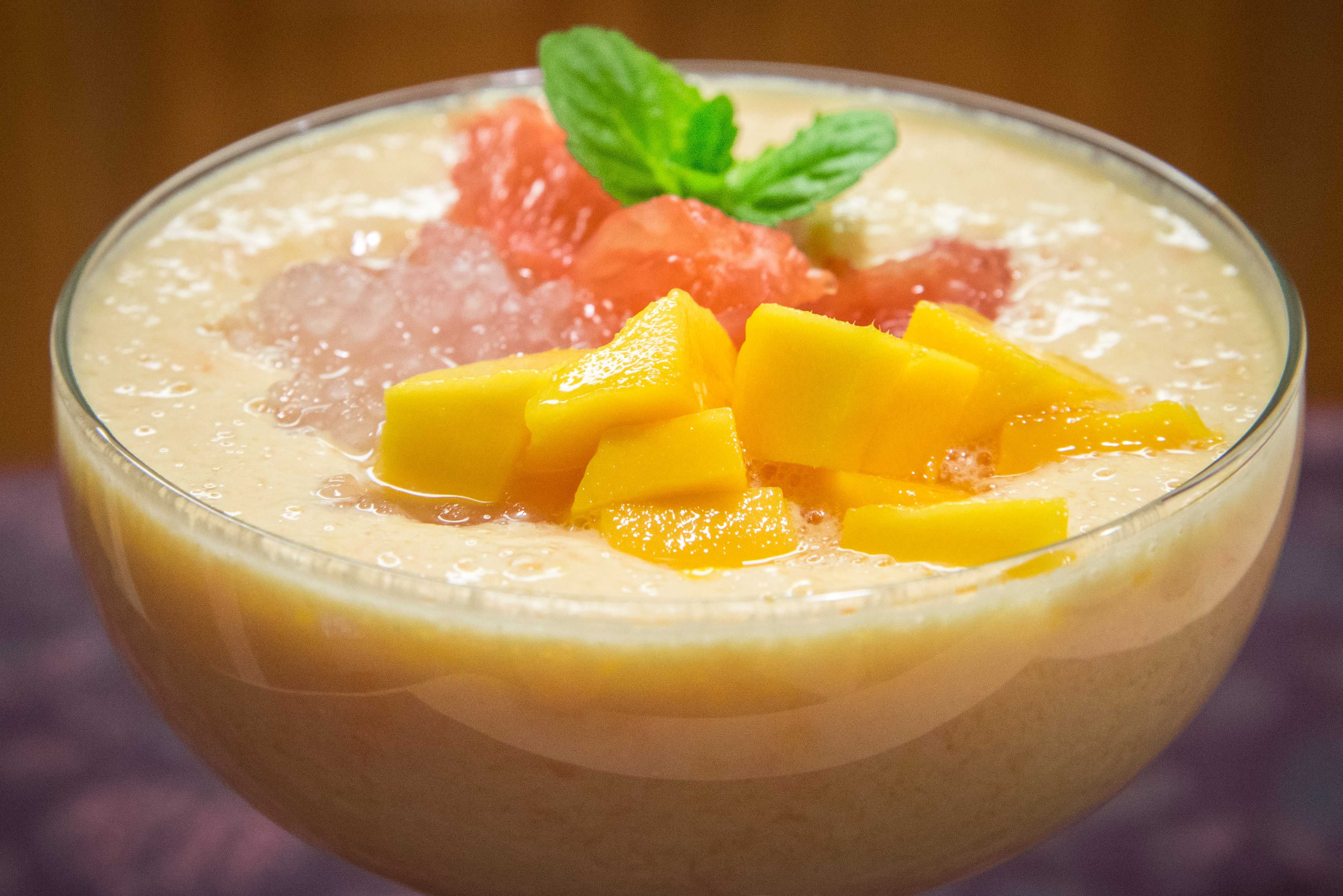 最后一定要隆重推荐这道让很多人都甚觉惊艳的芒杨枝甘露。芒果的甜遇到西柚的酸,香浓软滑的椰浆混合着浓浓的水果甜香,口感Q弹的西米露在口腔中欢快地碰撞,这称得上小编吃过的最好吃的杨枝甘露了: