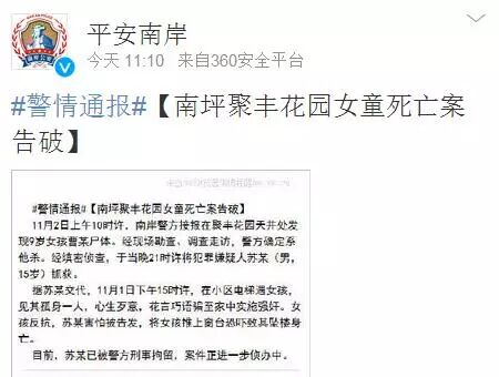 根据警方通报内容,据15岁的嫌疑人苏某交代,11月1日下午3时许,他在小区电梯遇女孩,见其孤身一人,心生歹意,花言巧语骗至家中实施强奸。女孩反抗,苏某害怕被告发,将女孩推上窗户恐吓致其坠楼身亡。
