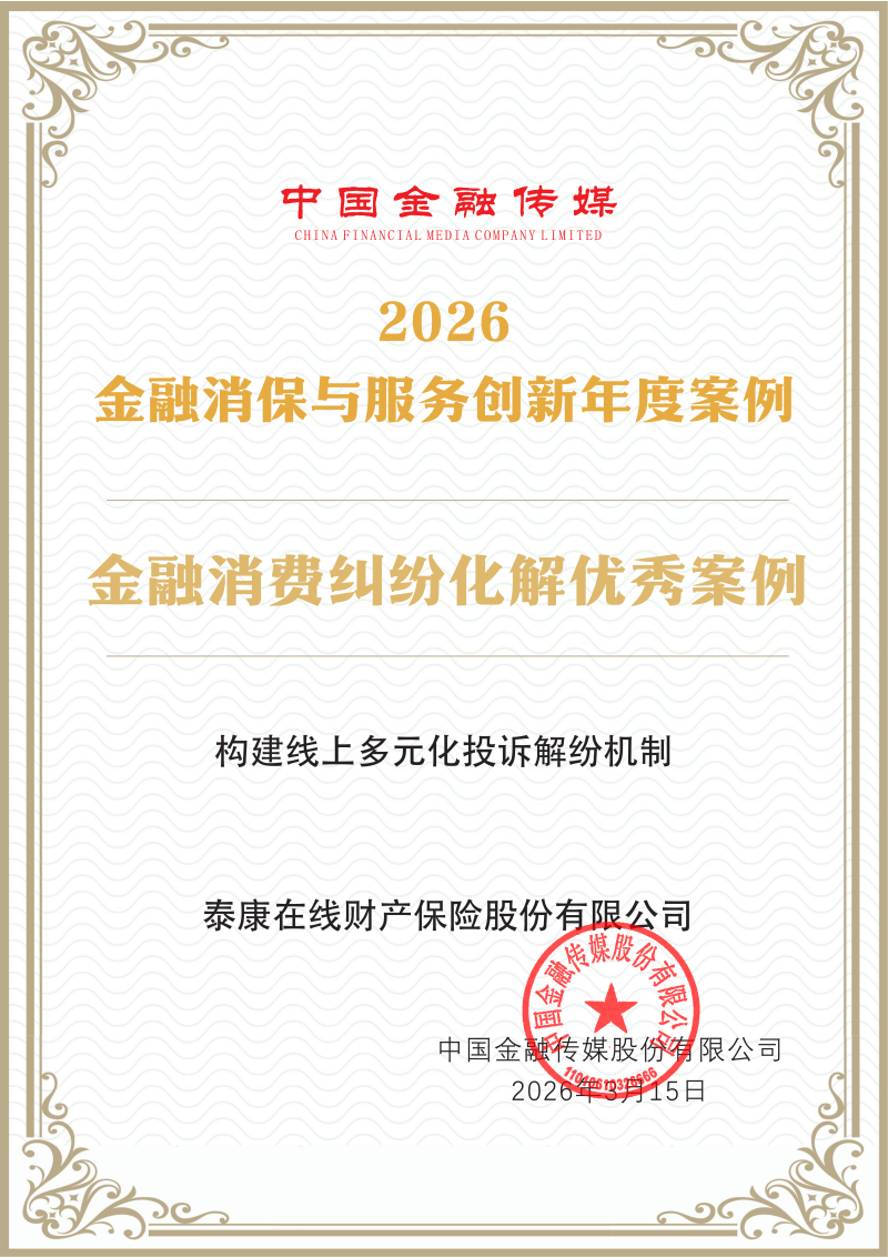 近日,中国金融传媒正式发布2026金融消保与服务创新年度案例名单,泰康在线财产保险股份有限公司凭借构建线上多元化投诉解纷机制的突出实践,成功获评“金融消费纠纷化解优秀案例”,成为保险业践行“枫桥经验”、以创新机制高效化解金融消费纠纷的标杆。